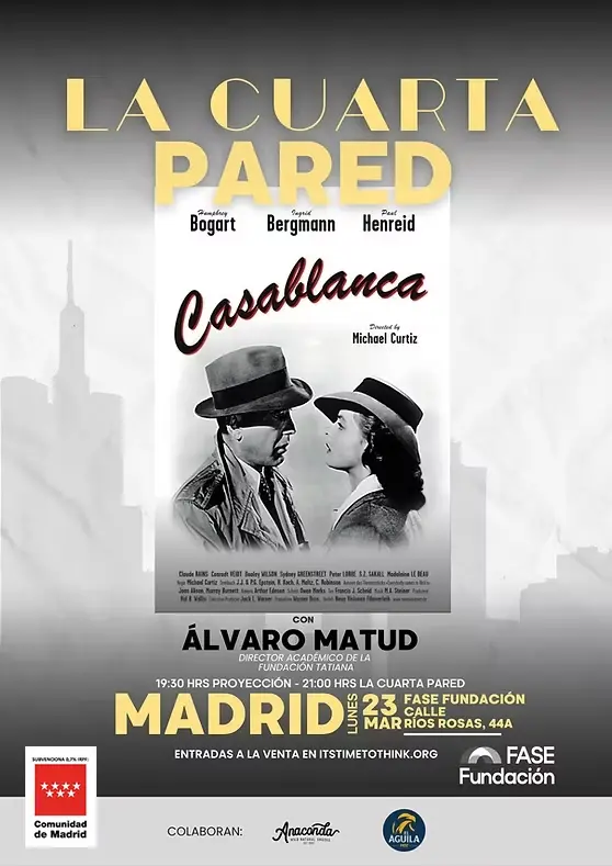 La película elegida fue Casablanca, uno de esos títulos que siguen ocupando un lugar privilegiado en la historia del cine. Tras la proyección, el coloquio estuvo guiado por Álvaro Matud Juristo, profesor universitario y director académico de la Fundación Tatiana Pérez de Guzmán el Bueno, especialista en historia del cine y pensamiento humanista. Su intervención ayudó a situar la película en su contexto histórico y cinematográfico, y permitió descubrir por qué esta obra sigue conmoviendo generación tras generación: por la fuerza de su guion, por la riqueza de sus personajes, por su trasfondo moral y por su capacidad para mostrar que las decisiones verdaderamente importantes exigen altura humana.