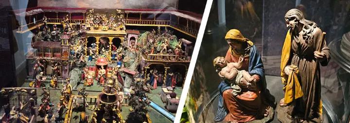 El hilo conductor fue “Un nacimiento, dos orillas. El Belén en el Perú virreinal” (siglos XVI–XVIII): mestizaje artístico entre España y el mundo inca. Una curiosidad preciosa del recorrido fue El Baúl del Nacimiento (procedente del Museo Pedro de Osma, Lima), con arquitecturas y figuras en madera, pasta de maguey y telas encoladas; más adelante, la muestra da paso a una Natividad del siglo XXI de los talleres de Ronald Flores Matto.